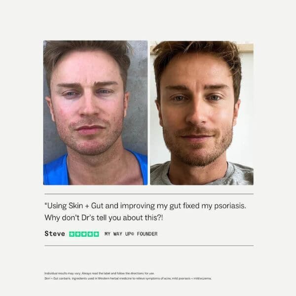 Skin + Gut™ combines probiotics, botanicals, vitamins, minerals and nutritional compounds traditionally used in Western herbal medicine to relieve symptoms of acne, dermatitis, mild eczema and mild psoriasis, while supporting healthy digestive function.